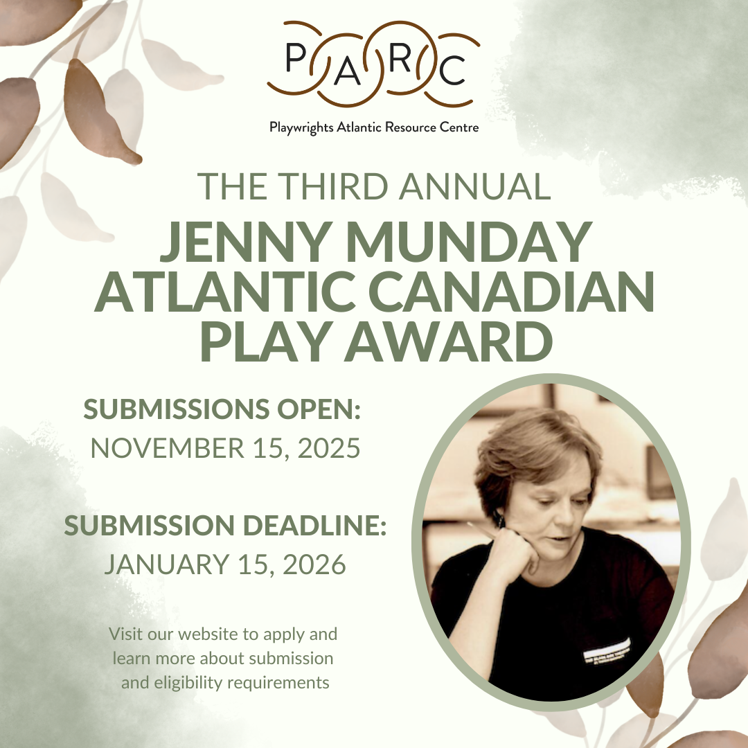Playwrights Atlantic Resource Centre (PARC) is honoured to announce the third annual Jenny Munday Atlantic Canadian Play Award. This award honours Jenny Munday, PARC’s inaugural Artistic Director who dedicated 20 years of service to the organization, celebrating her legacy while providing vital support and recognition to playwrights from Atlantic Canada.